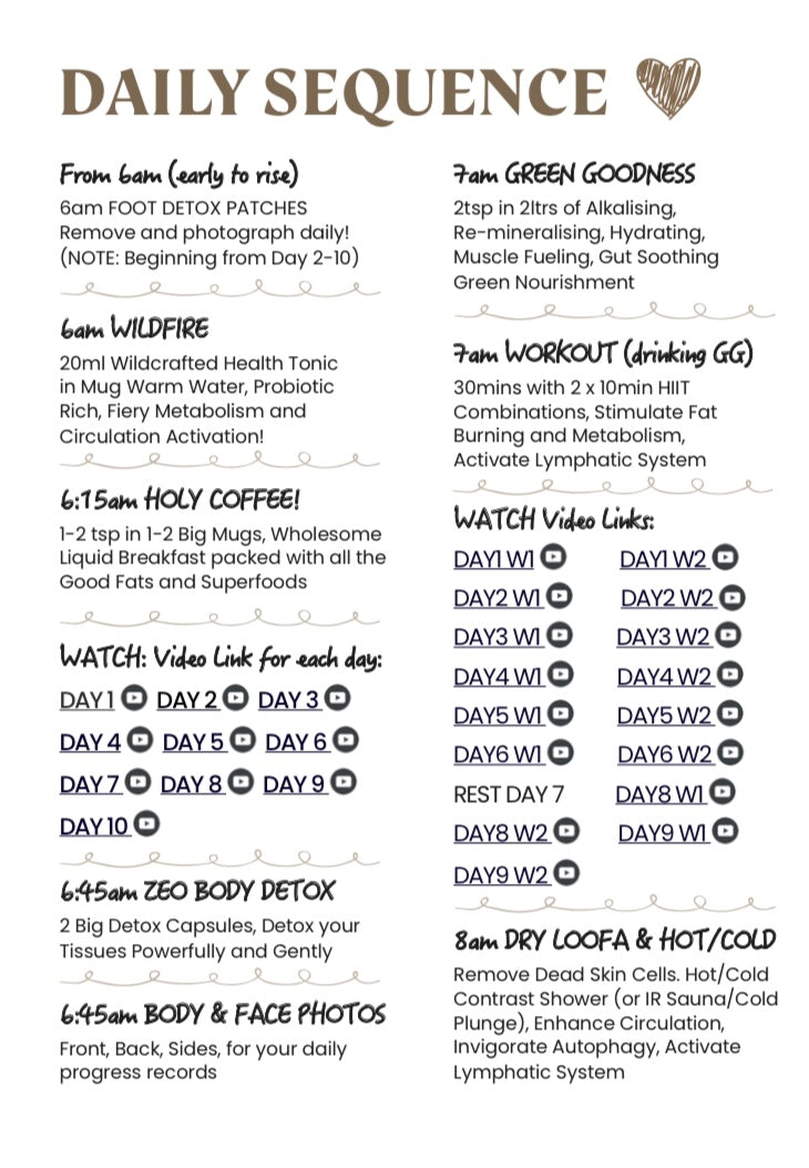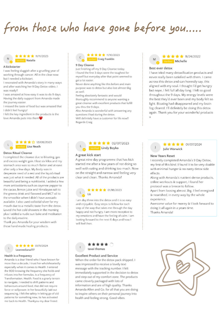 Goodness - where do I start! The main purpose of deciding to do Amanda's 9DD was to re-set and cleanse my system as I had so much inflammation and toxicity, and my gut was in poor health. I had been deceiving myself for some time that I was in good health and eating well, but I felt completely stuck and didn't know how to get out of the bad habits and poor food choices. Following Amanda's protocol helped me enormously to get back into a flow of a healthy, beautiful morning routine, daily exercising, and detox and remove toxins in such a gentle way that apart from being hungry, I didn't have any of the awful detox symptoms I've experienced in the past. This was also a spiritual fast for me to nourish and honour the temple God has blessed me with, and to remove anything that was hindering my relationship with Him. Food had become an idol for me and our God is a jealous God! He loves us so much and He wants us to put Him first in everything we do because He created us! I'm only 5"2 with a small build, but hold all my weight in my tummy which had me feeling shameful and depressed, and I was choosing chocolate and potato chips to numb those feelings. I lost 1.5kilos in total but I didn't have a lot to lose. I've never slept better in my life than I have these past 9 days, all the inflammation in my stomach has gone, my skin has cleared up and I'm motivated to exercise again remembering how good it makes me feel. Today is day 10, and instead of waking up running to the fridge/pantry to eat something, I've had my wildfire tonic, holy coffee, made up my greens, exercised, took the dog for the walk, and then prepared my first meal! This isn't just a detox, it's a new way of life - a life of health and vitality, and freedom from shame, depression and excuses! I want to honour and thank Amanda for the commitment she made to document her own 9DD journey so that we have had the opportunity to follow along with her. I can honestly say that I don't think I would have made the 9 days without her daily encouragement, her raw and real emotions, and the exercise videos. I would like to add that the next time I embark on this journey, I would not do it again in the middle of a Victorian winter!! Sweating is an important part of the detox and there was definitely not a lot of that happening!! I was freezing cold throughout but I did read that changes in body temperatures are a normal symptom when detoxing. You will not regret your decision to do this for yourself. I'm off to purchase more products to ensure I never run out!!